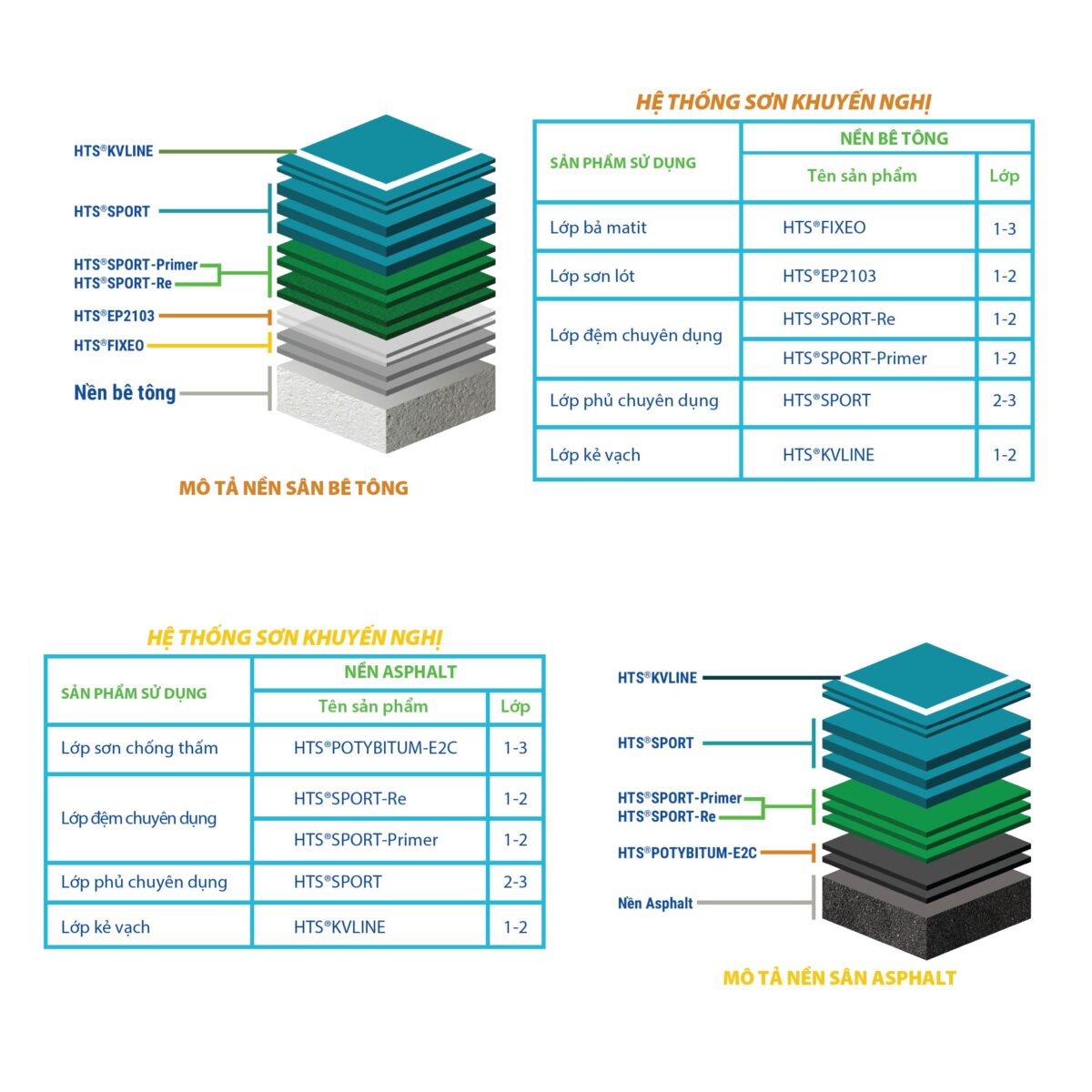 Sau khi nền hạ đã ổn định, bề mặt sân sẽ được phủ lớp sơn chuyên dụng như Sơn HTS®SPORT. Lớp sơn này giúp tạo ra một bề mặt chơi an toàn, chống trơn trượt và chịu được các yếu tố thời tiết.